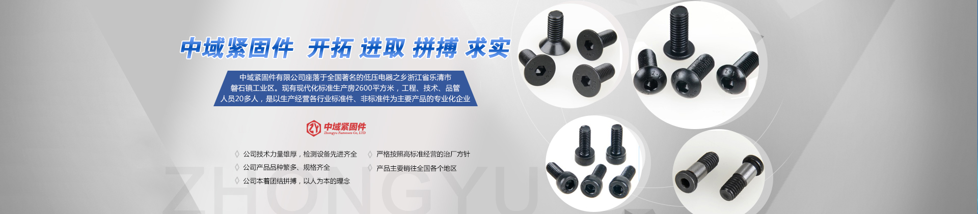 浙江中域緊固件有限公司創(chuàng)辦于2009年,現(xiàn)有現(xiàn)代化標(biāo)準(zhǔn)生產(chǎn)房3000平方米,工程、技術(shù)、品管人員20多人,是以生產(chǎn)經(jīng)營(yíng),各行業(yè)標(biāo)準(zhǔn)件、非標(biāo)準(zhǔn)件為主要產(chǎn)品的專(zhuān)業(yè)化企業(yè)。大規(guī)模化生產(chǎn)各種非標(biāo)高強(qiáng)度內(nèi)六角10.9級(jí)12.9級(jí)8.8級(jí)螺釘、現(xiàn)貨發(fā)黑藍(lán)白DIN7991平杯、ISO7380圓杯,DIN912杯頭。7380.2帶墊圓杯,并可按客戶(hù)要求生產(chǎn)及設(shè)計(jì)